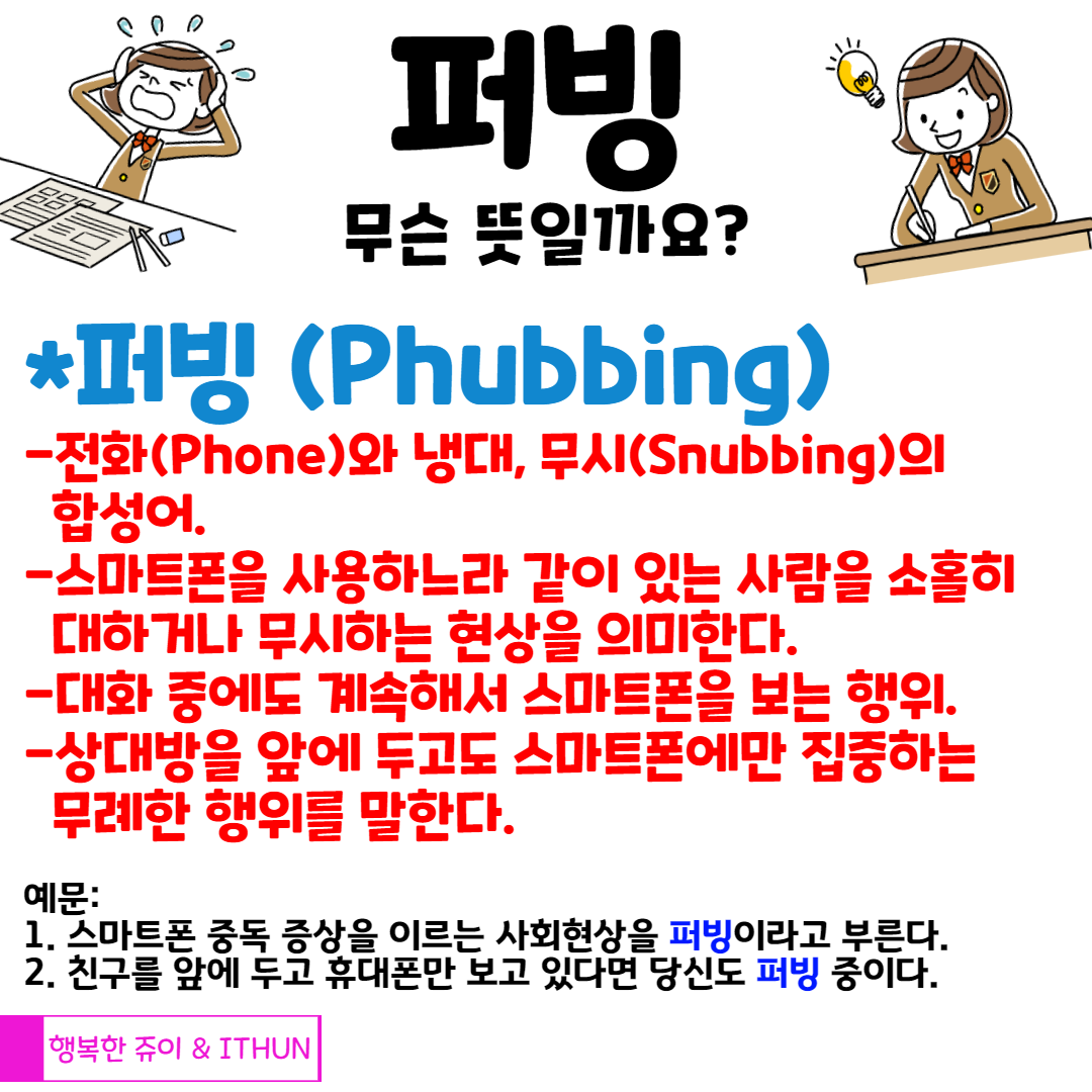 - 퍼빙(Phubbing)이란? 상대방과 대화 중에도 계속해서 스마트폰에만 집중하는 행위