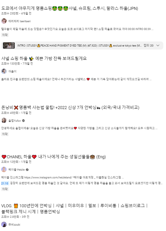 유튜브에 '명품 하울' 을 검색하니 정말 엄청나게 많은 영상 콘텐츠들을 확인할 수 있었다. 이름만 들으면 알 만한 샤넬, 루이비통, 명품 하울 등 보고 있으면 대리 만족? 먹방을 보고 있는 것처럼 들 수도 있겠지만 아무리 노력해도 구매할 수 없다는 현실을 자각한다면 영상을 보면서 괴리감이 들 거라는 생각이 들었다.