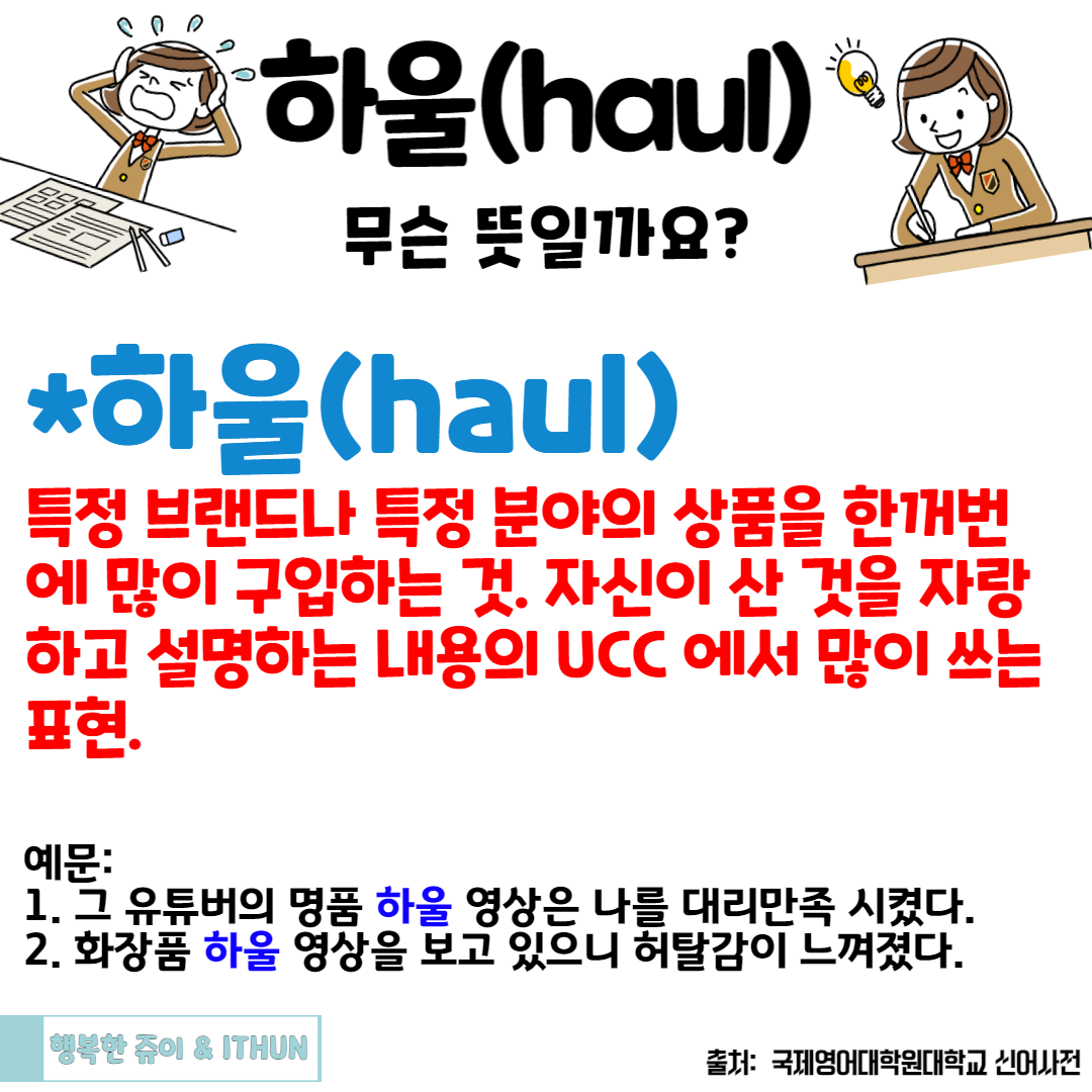 '하울' 은 영어 단어에서 온 것으로 요즘은 특정 브랜드나 특정 분야의 상품을 한꺼번에 많이 구입하여 자신이 산 것을 자랑하고 설명하는 영상에서 많이 쓰는 표현이다.
