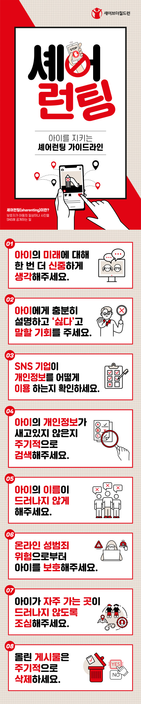 세이브더칠드런의 "셰어런팅 가이드라인" 1. 아이의 미래에 대해 한 번 더 신중하게 생각해 주세요. 2. 아이에게 충분히 설명하고 '싫다' 고 말할 기회를 주세요. 3. SNS 기업이 개인정보를 어떻게 이용 하는지 확인하세요. 4. 아이의 개인정보가 새고 있지 않은지 주기적으로 검색해 주세요. 5. 아이의 이름이 드러나지 않게 해 주세요. 6. 온라인 성범죄 위험으로부터 아이를 보호해 주세요. 7. 아이가 자주 가는 곳이 드러나지 않도록 조심해 주세요. 8. 올린 게시물은 주기적으로 삭제하세요.