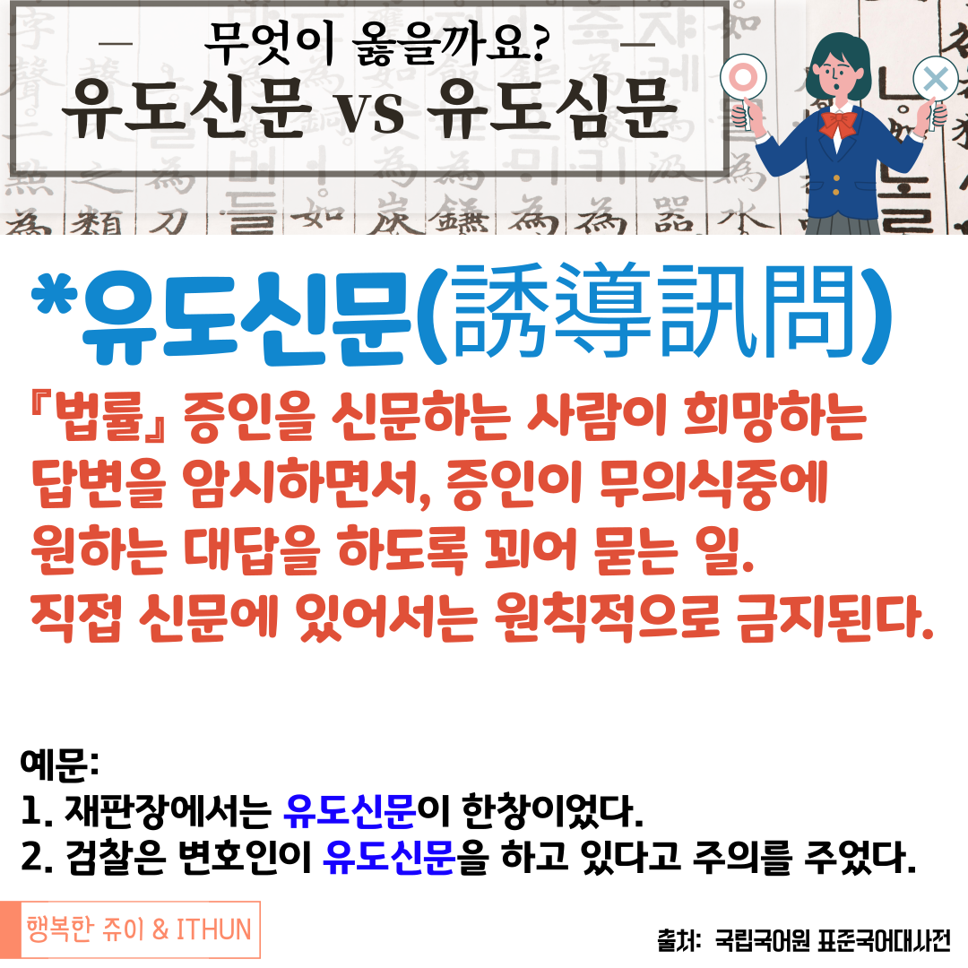 국립국어원 표준국어대사전에서 '신문' 과 '심문' 에 대해 정리하고 나니 사람들이 충분히 '유도신문' 과 '유도심문' 을 헷갈렸겠구나! 라는 생각이 들었다.