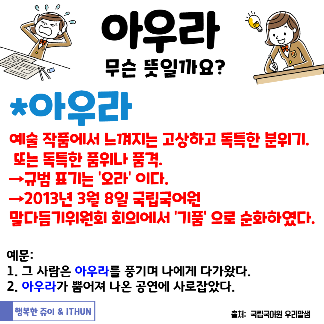 출처: 온라인가나다 상세보기('아우라'의 쓰임) | 국립국어원 (korean.go.kr)