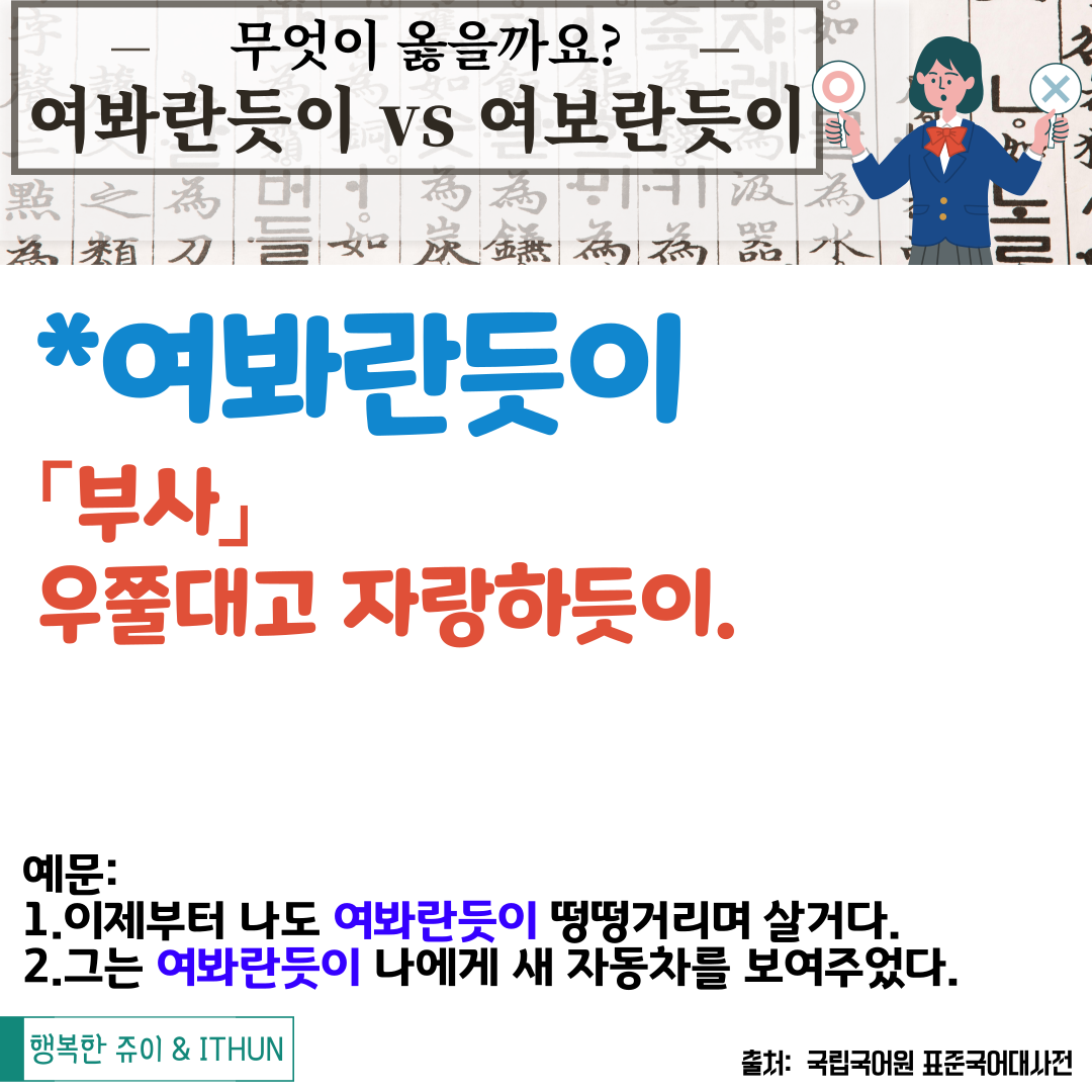 오늘은 '여봐란듯이' 와 '보란 듯이' 에 대해 정리해 보았다.