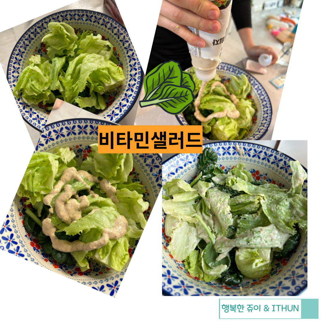 양상추를 구매하여 양상추를 적당한 크기로 자르고, 비타민을 적당한 양 수확하여 양상추와 비타민을 볼에 담은 후 마트에서 구매한 흑임자 드레싱을 뿌려서 먹으면 된다. 드레싱은 본인의 취향대로 선택하면 될 듯 ㅎ 더 맛있게 먹고 싶으면 오이를 잘라 넣던지 방울 토마토를 넣어 먹어도 좋을 듯 싶다. 지난 번엔 사과를 슬라이스해서 넣었는데 괜찮았다. ^^