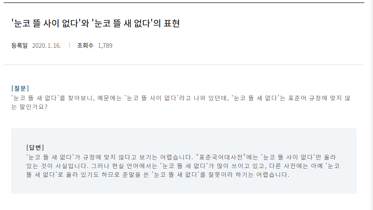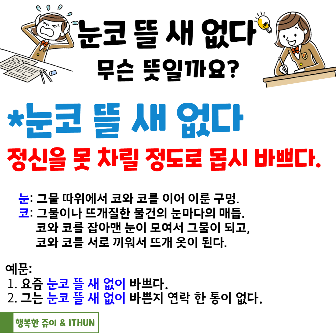 눈코 뜰 새 없다/눈코 뜰 사이 없다. 자주 사용하는 말이다. '정신 없이 바쁘다' 라는 의미로 자주 쓴다. 그런데 이번에 내가 눈코 뜰 새 없다/눈코 뜰 사이 없다 에 대해 잘못 알고 있는 부분이 있었다는 것을 알게 되었다. 그래서 나처럼 또 오해하는 이가 없길 바라며 정리해 본다.