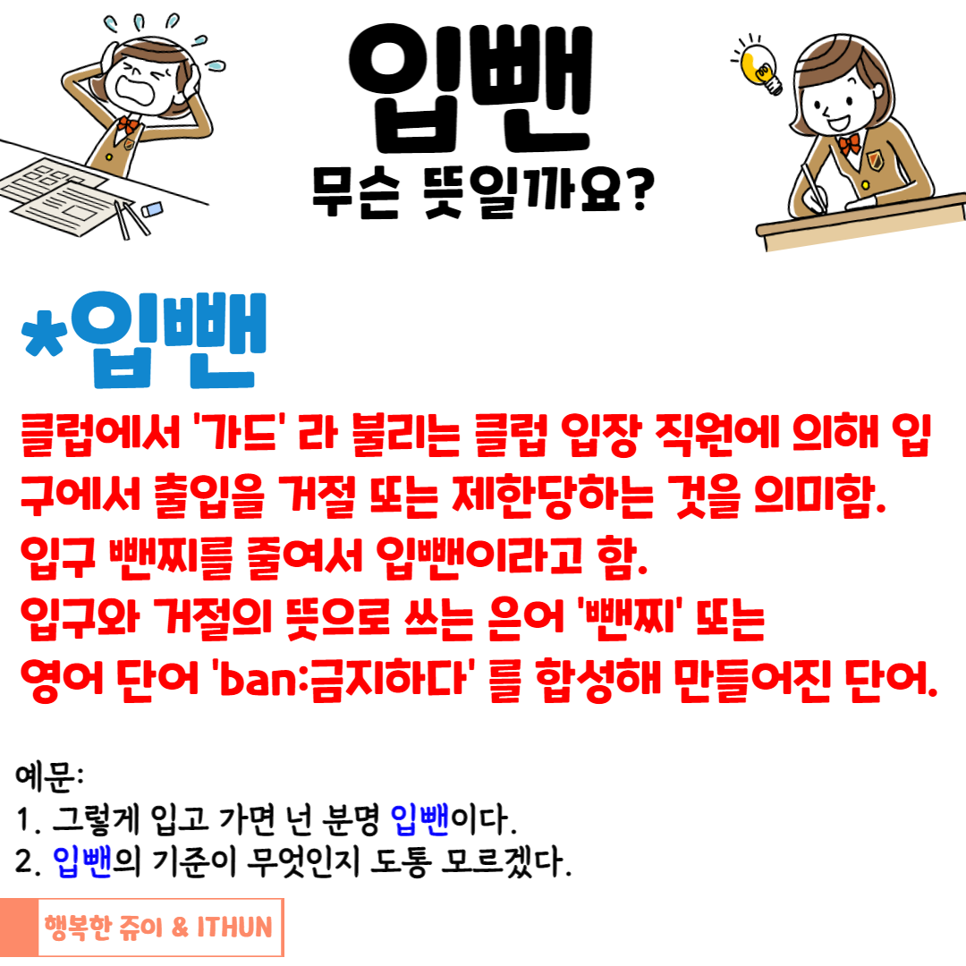 입뺀에서 클럽 '가드' 에게 입구에서 거절당하게 되는 것인데 최근 내가 좋아하는 모범택시2 에서도 극 중 김도기님이 클럽 가드로 변신해 이와 비슷한 연기를 했던 장면이 떠올랐다. 의미를 알면 조금은 퇴폐적이고 외모지상주의의 느낌이 강해 부정적으로 느껴질 수 있지만 지금은 그냥 재미로, 가볍게 사용하는 듯한 분위기이다.