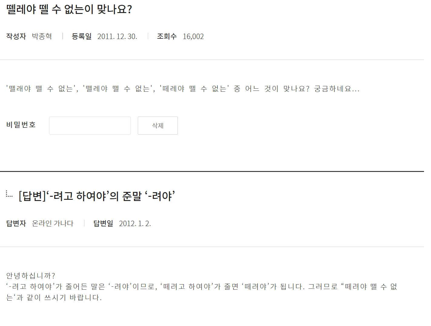 국립국어원 사이트 내의 온라인 가나다의 질문을 검색해보았다.