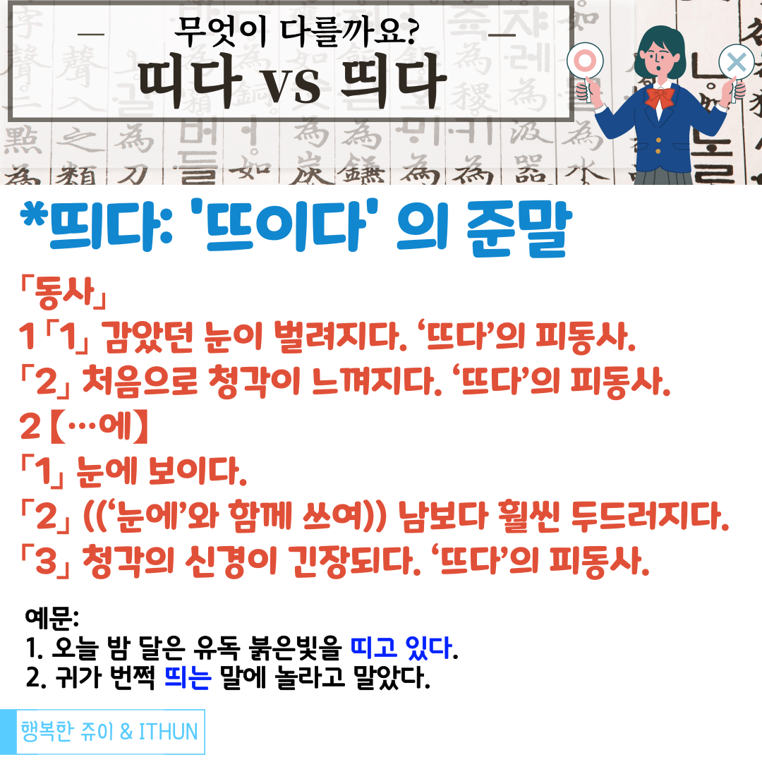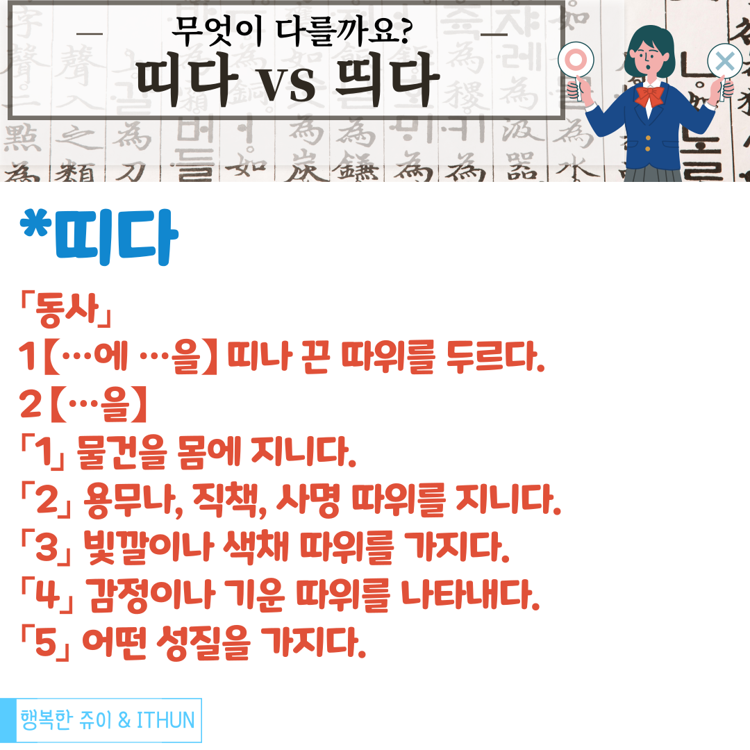 오늘은 '띠다' 와 '띄다' 에 대해 정리해 보았다.