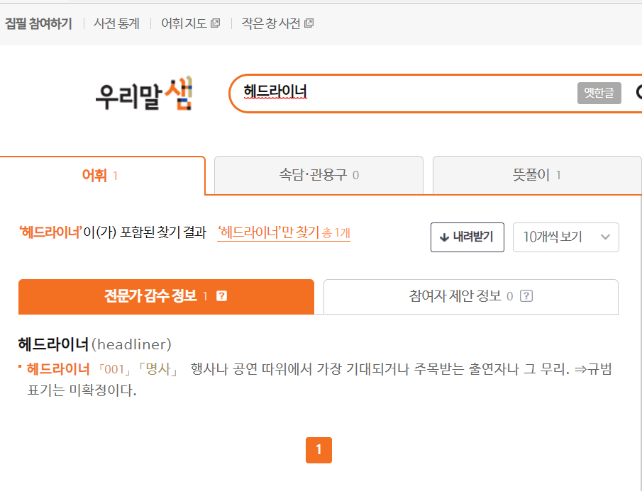 우리말샘에서 '헤드라이너' 를 찾아보았다.