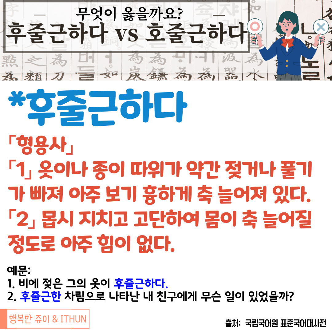 오늘은 '후줄근하다VS호줄근하다' 를 정리하며 잘못된 표현인 '호줄근하다' 를 찾고 '후줄근하다' 와 비슷한 뜻인 '호졸근하다' 를 정리해 보았다.