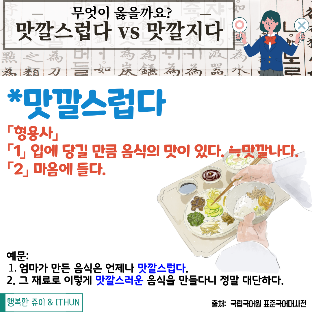 아 그리고 '맛깔스럽다' 대신에 사용할 수 있는 '맛깔나다' 도 잊지 말고 기억하자!