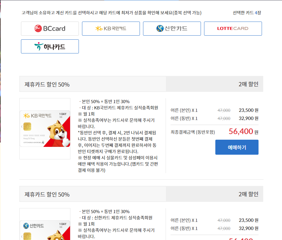 (세부 내역에서 할인 혜택이 어떻게 되는지 꼭 확인하자, 보통 본인 50%+동반 1인 30%)