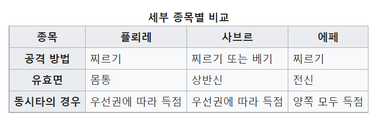 에페(Épée) :먼저 피를 흘리는 쪽이 진 것으로 간주하는 과거 '결투'에서 유래하였다. 전신을 표적으로 하는 찌르기형 중량 무기로 난이도가 가장 높다. 모든 공격은 찌르기만 가능하며, 베기는 무효이다. 베기를 하였을 경우에는 득점이 인정되지 않으며 경기가 정지되지 않는다. 플뢰르와 사브르와는 달리, 에페는 프리오리테가 없어 동시타격이 발생한 경우 양쪽 모두 투셰로 인정된다. 그러나, 개인전에서 양선수가 14점, 단체전에서 양팀이 44점을 득점한 상황에서 꾸 드불(Coup Double: 상격)이 발생한 경우 양쪽 모두 득점이 인정되지 않는다.