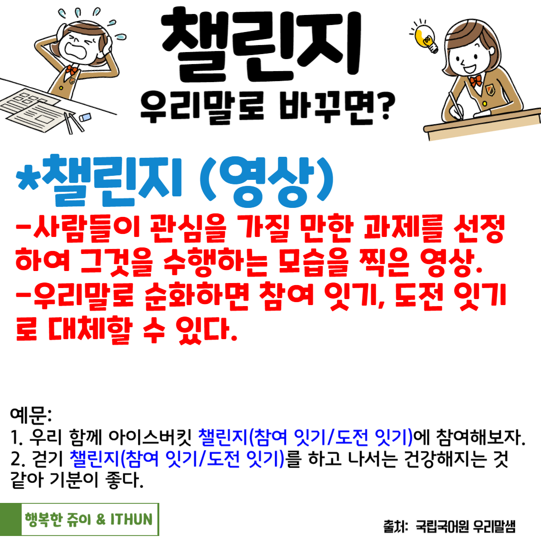오늘은 챌린지의 뜻과 챌린지를 우리말로 표현하면 어떤 표현이 되는지 알아보겠다.
