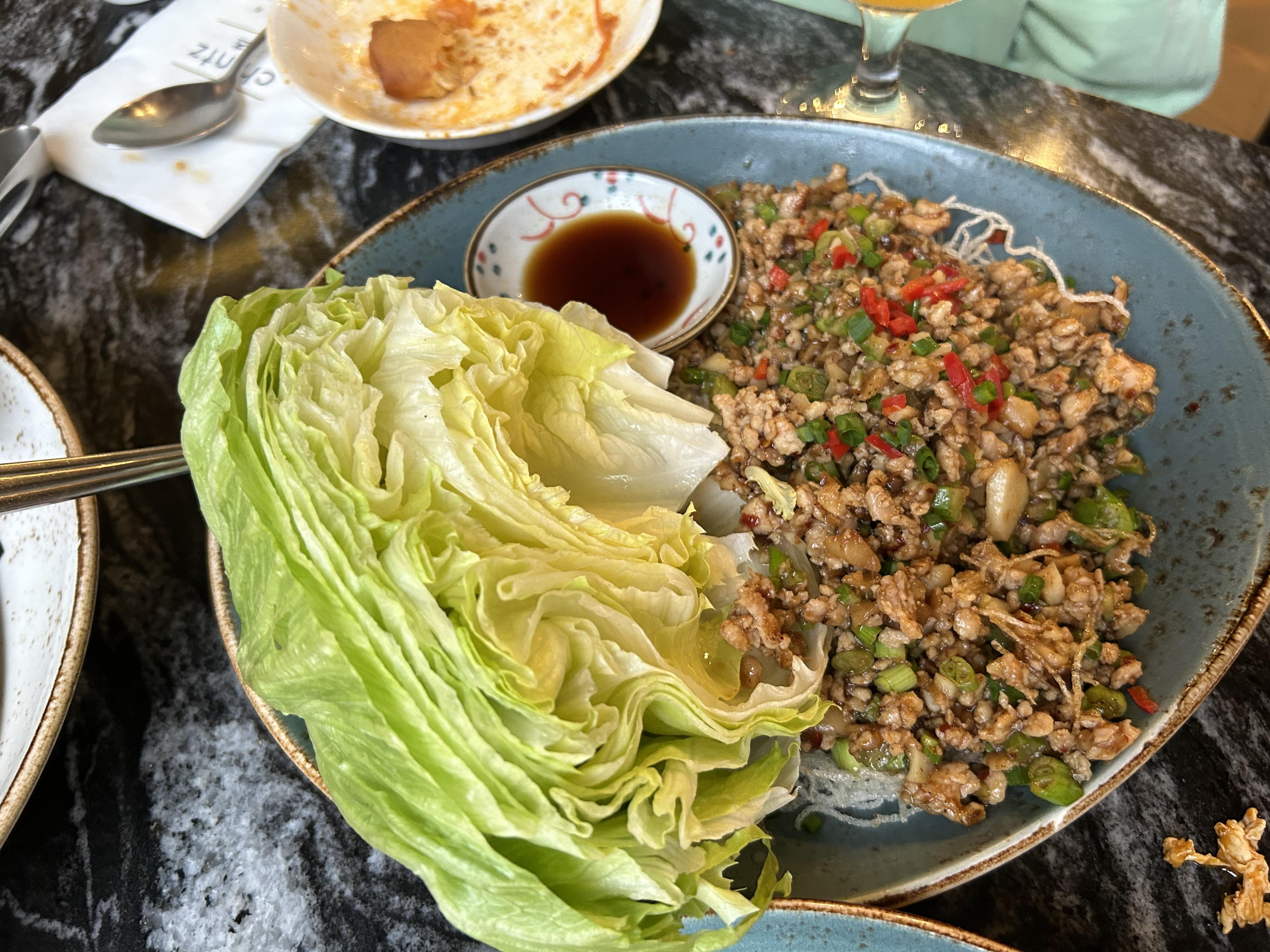 저기 보이는 양상추에 다진 닭고기와 야채볶음을 싸서