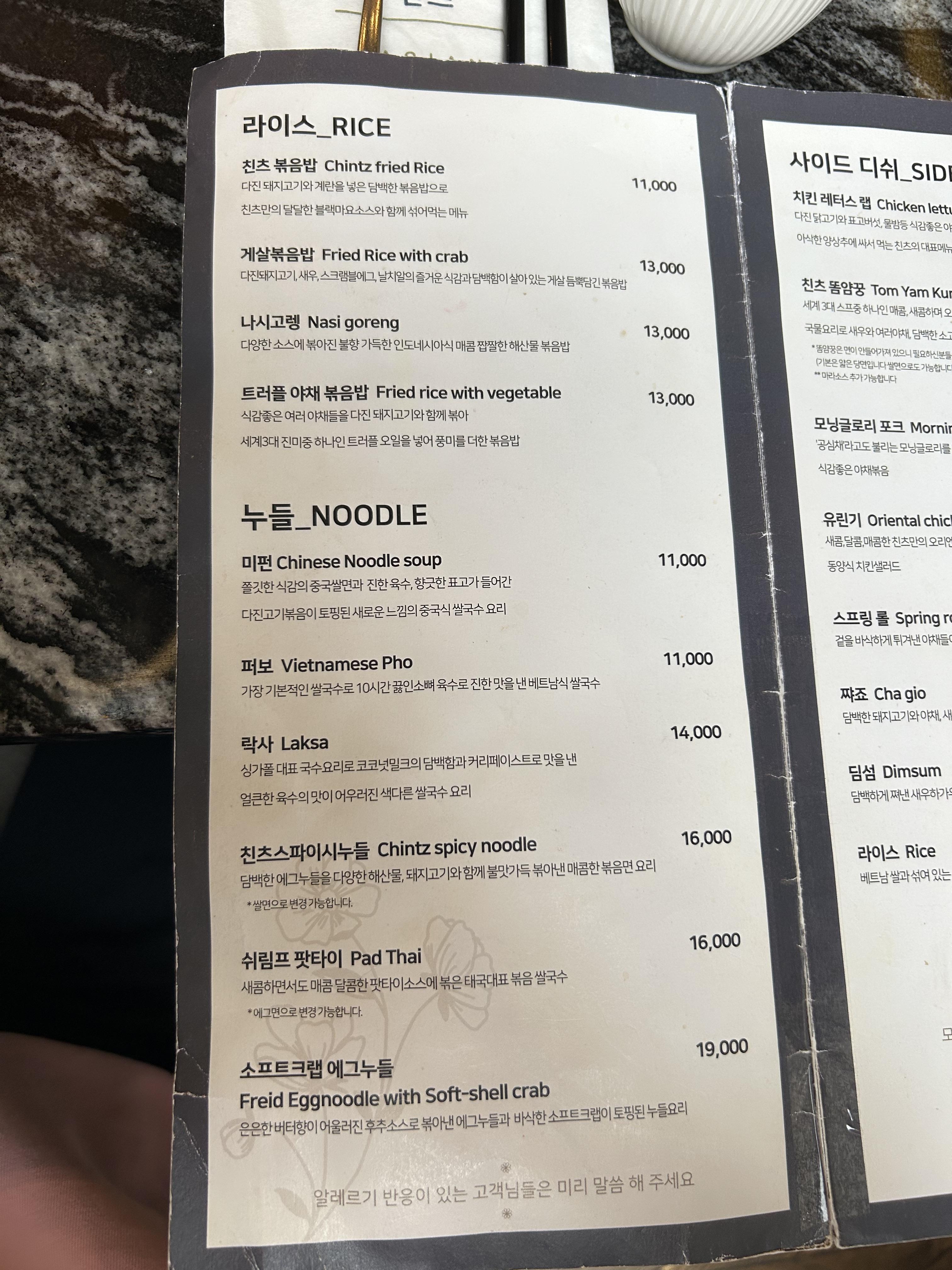 라이스, 누들, 사이드 디쉬로 메뉴가 나누어져있고