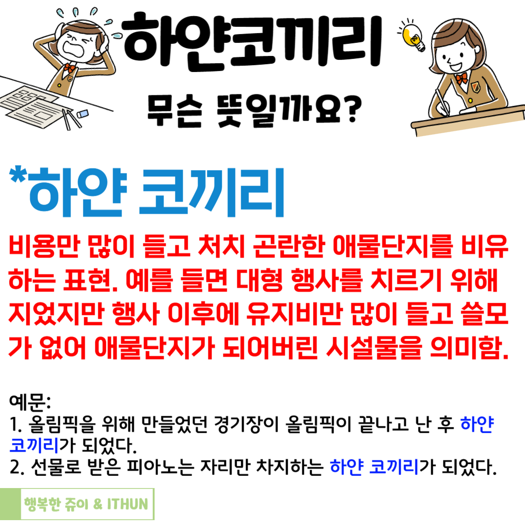 어떤 행사를 위해 만들어진 건물이 행사가 끝난 후에 딱히 쓸모가 없어 유지하는데 관리 비용이 많이 드는 경우 또는 막상 쓸모는 없는 데 유지하는 데 드는 비용이 많이 드는 것들을 비유할 때 하얀 코끼리라고 이야기하면 되는구나! 싶었다.