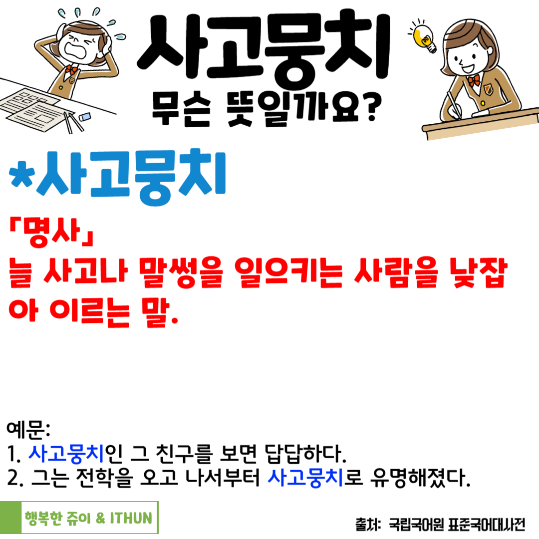 이렇게 '사고뭉치'의 뜻을 정리할 수 있다.