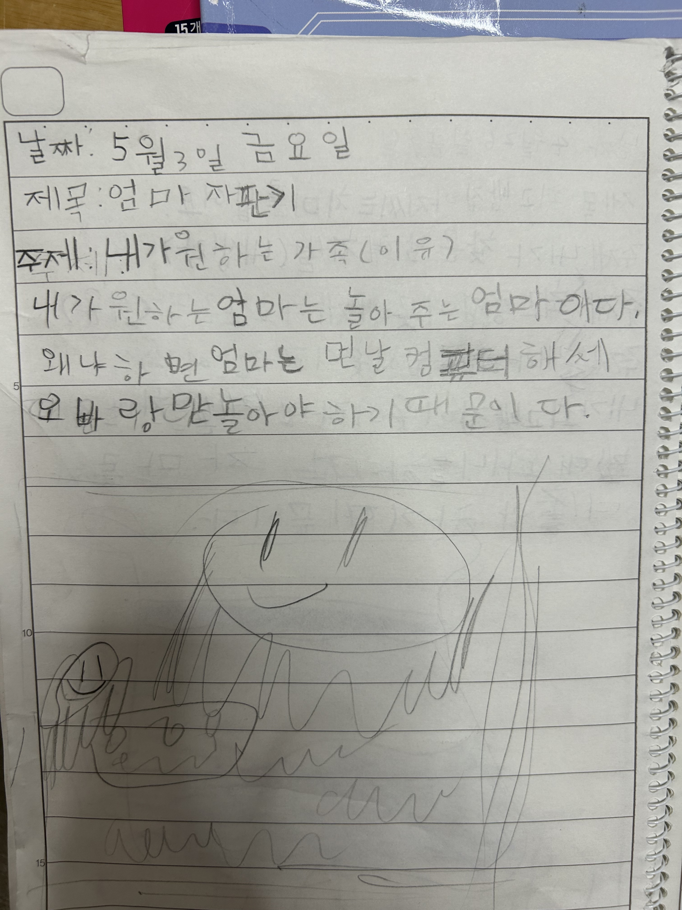 왜냐하면 엄마는 맨날 컴퓨터만 해서 오빠랑만 놀아야 하기 때문이다.