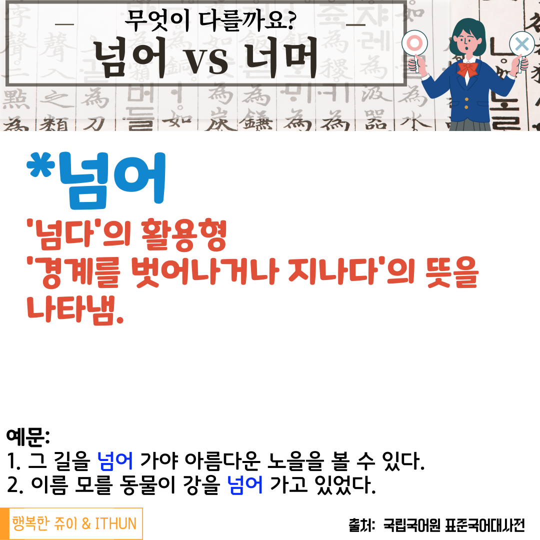 그런데 '넘어'로 쓰지 않고 '너머'로 쓰는 이유는 다음과 같다.