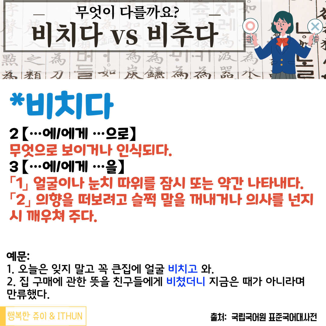 오늘은 비치다 vs 비추다에 대해 정리해보려고 한다.
