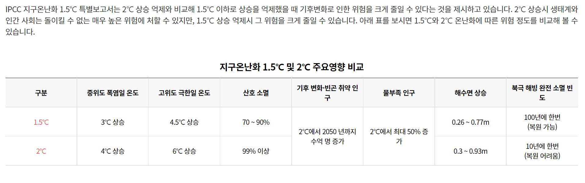 - 지구의 온도가 2℃ 이상 상승할 경우, 폭염 한파 등 보통의 인간이 감당할 수 없는 자연재해가 발생한다. 상승 온도를 1.5℃로 제한할 경우 생물다양성, 건강, 생계, 식량안보, 인간 안보 및 경제 성장에 대한 위험이 2℃보다 대폭 감소한다.