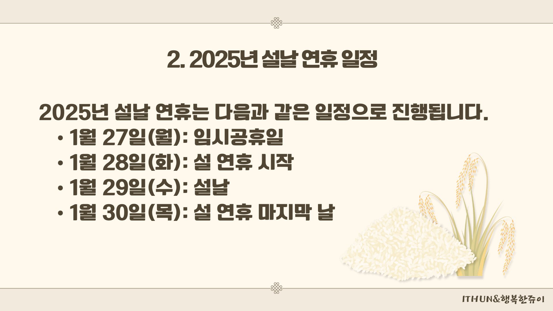 이 정보가 여러분에게 도움이 되었기를 바랍니다. 즐거운 설날 연휴 되세요!