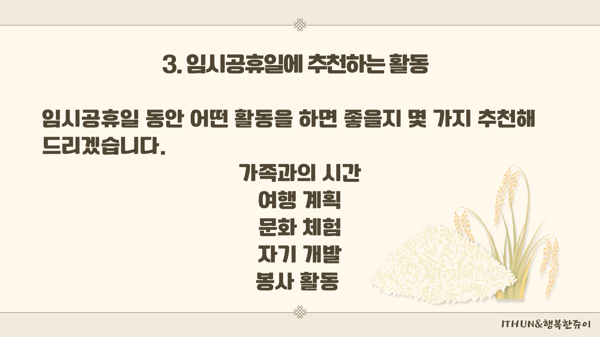 - 자기 개발 : 여유로운 시간을 활용해 독서나 취미 활동을 즐기는 것도 추천합니다. 평소에 하고 싶었던 일을 시도해보는 기회가 될 수 있습니다.