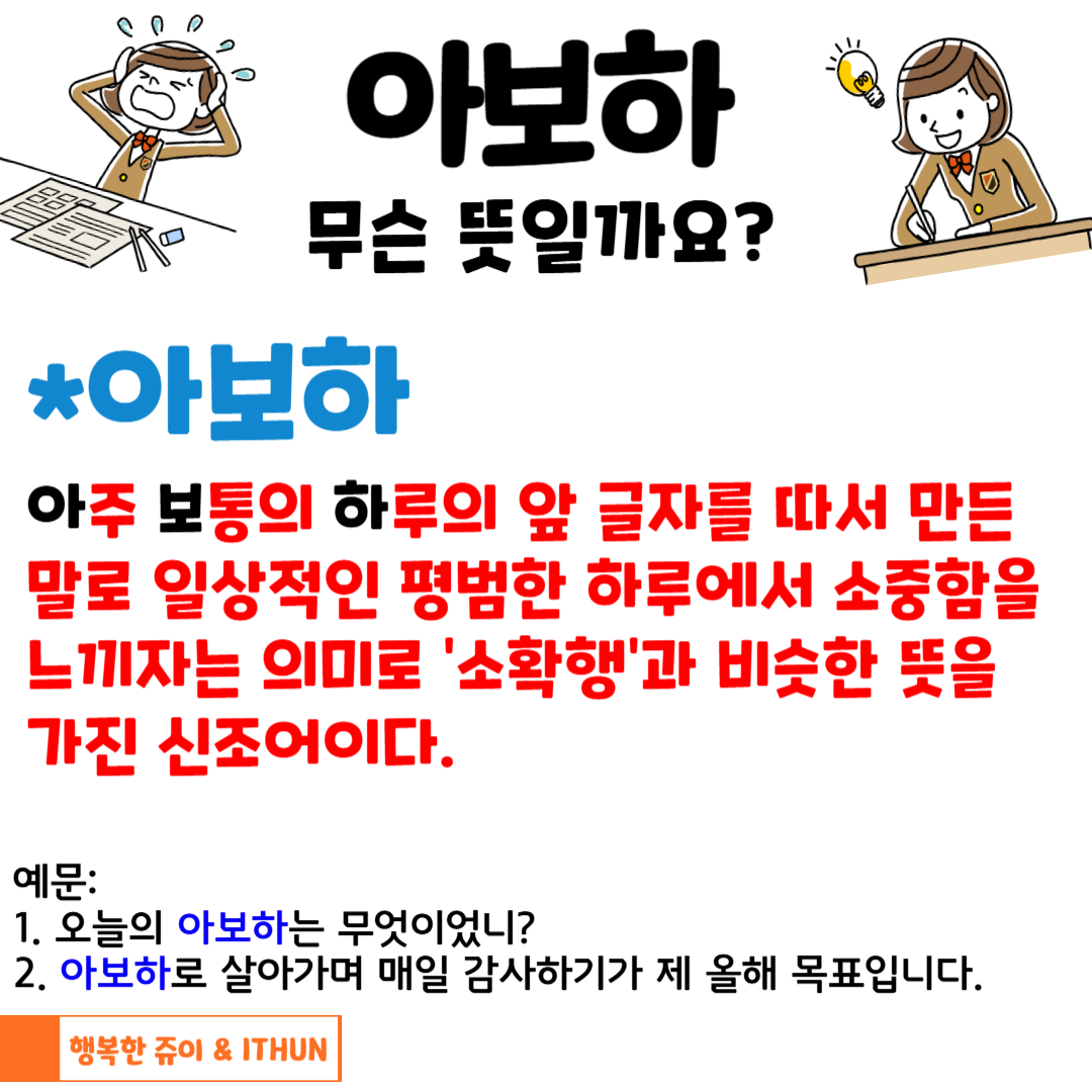 '아주 보통의 하루'를 줄인말로 앞글자를 따서 '아보하'라고 한다.