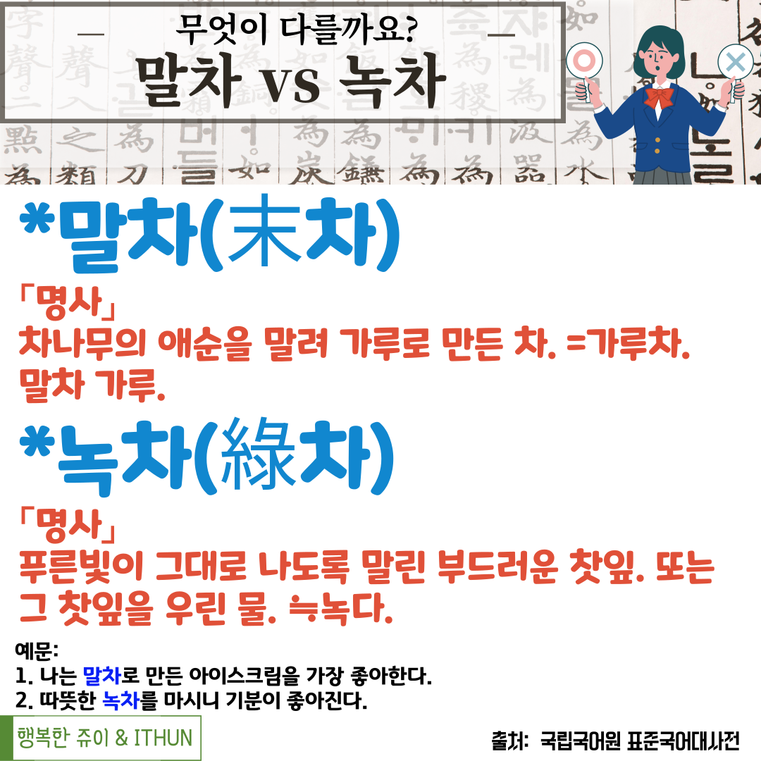 '말차'와 '녹차'가 이런 차이점이 있었다니 사실 '말차'는 표준어가 아닌 줄 알았다. 그런데 한자+고유어, 합성어였다니 0_0 놀라웠다. '말차'와 '녹차'의 차이점과 각각의 건강상 이점은 무엇인지 아래 그림으로 정리해보았다. ^^