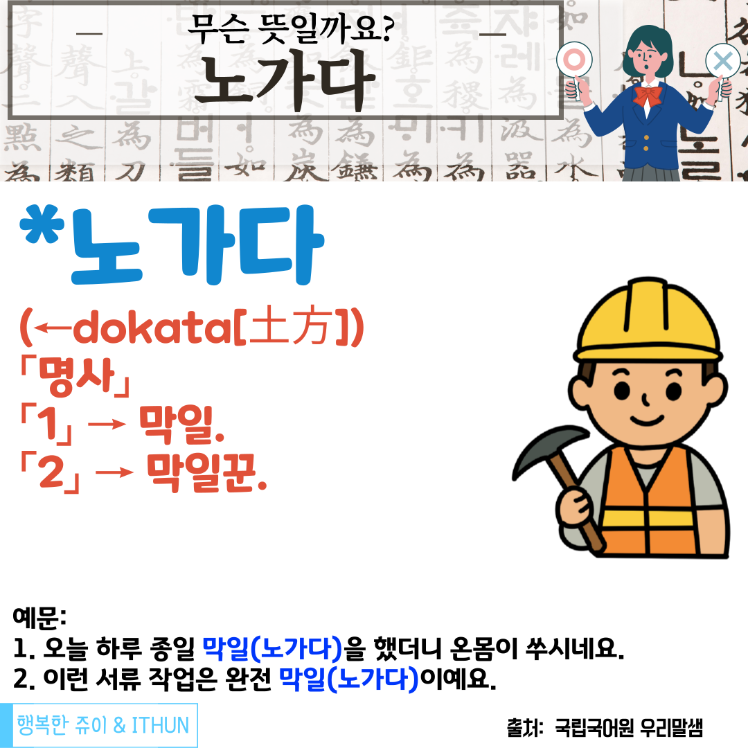 '노가다'는 일본어 '도카타(土方, どかた)'에서 유래된 단어다. '도카타'는 원래 흙(土)을 다루는 사람, 즉 토목 또는 건축 현장의 노동자를 의미하는 말이었다. 이 단어가 한국으로 넘어오면서 발음이 변형되어 '노가다'로 굳어졌다.