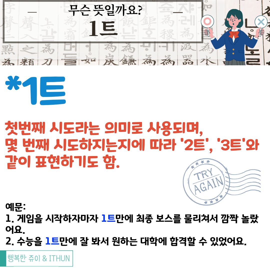 아하, 그럼 '1트'가 '1'+ 'try' 영어 단어가 합쳐진 신조어인가?