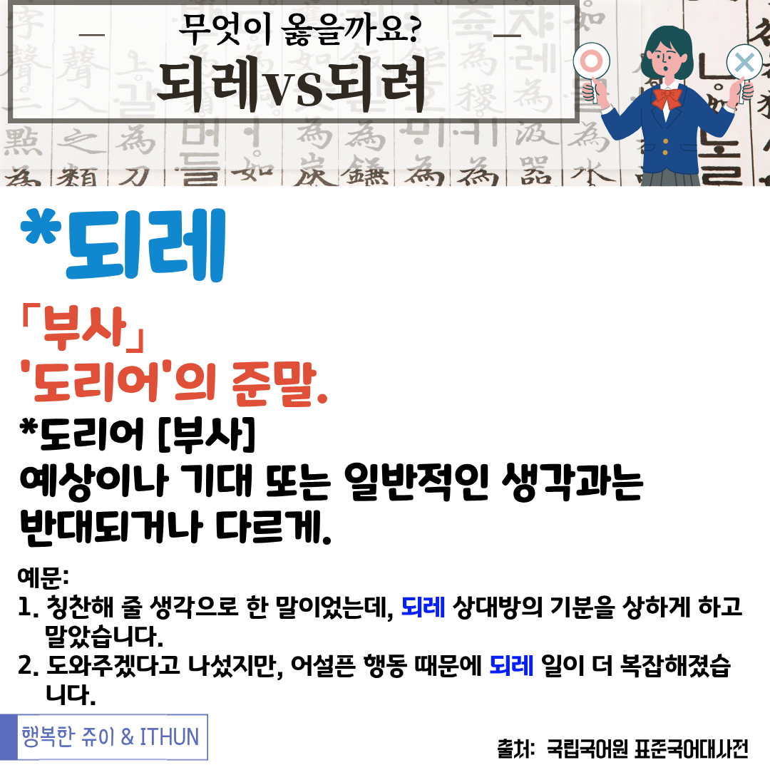 오늘은 '도리어', '되레'에 대해 정리해 보았다.