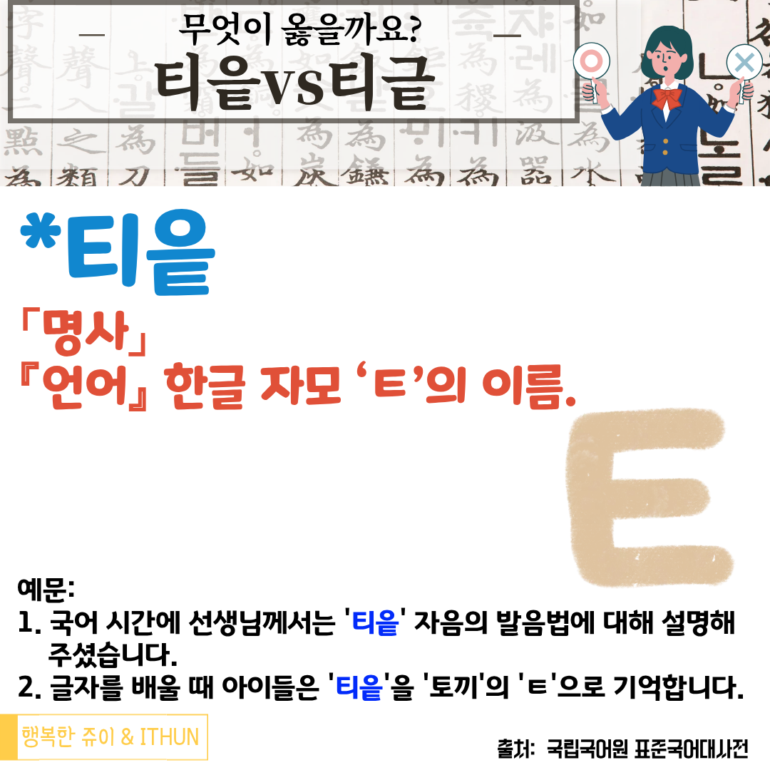 2번 받아쓰기 시험에서 '티긑'이 들어간 단어는 언제나 헷갈린다. (X)